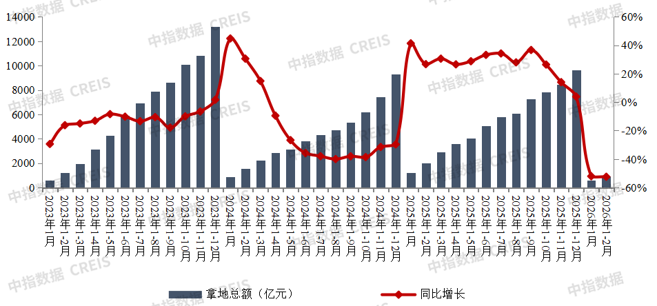 图:2023年-2026年2月TOP100房企累计拿地总额及同比