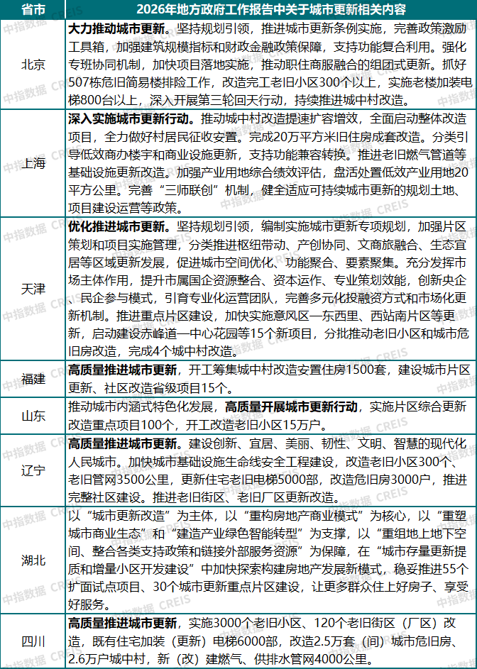 表:2026年部分省市政府工作报告中关于城市更新相关内容表述