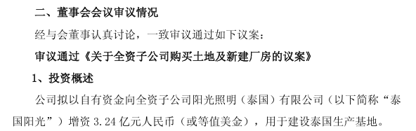 3月9日,浙江阳光照明电器集团股份有限公司(简称“阳光照明”)发布公告,公司第十届董事会第十六次会议审议通过《关于全资子公司购买土地及新建厂房的议案》,拟以自有资金向全资子公司阳光照明(泰国)有限公司增资3.24亿元人民币,用于建设泰国生产基地。