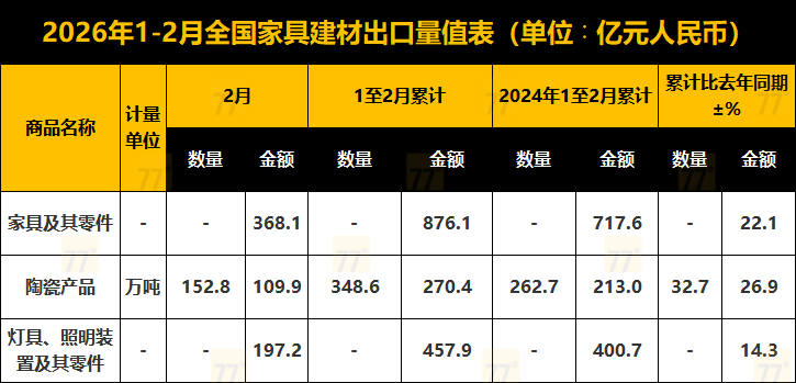 家居出口强劲开局!1-2月家具出口876亿大增22.1%,陶瓷、灯具齐涨