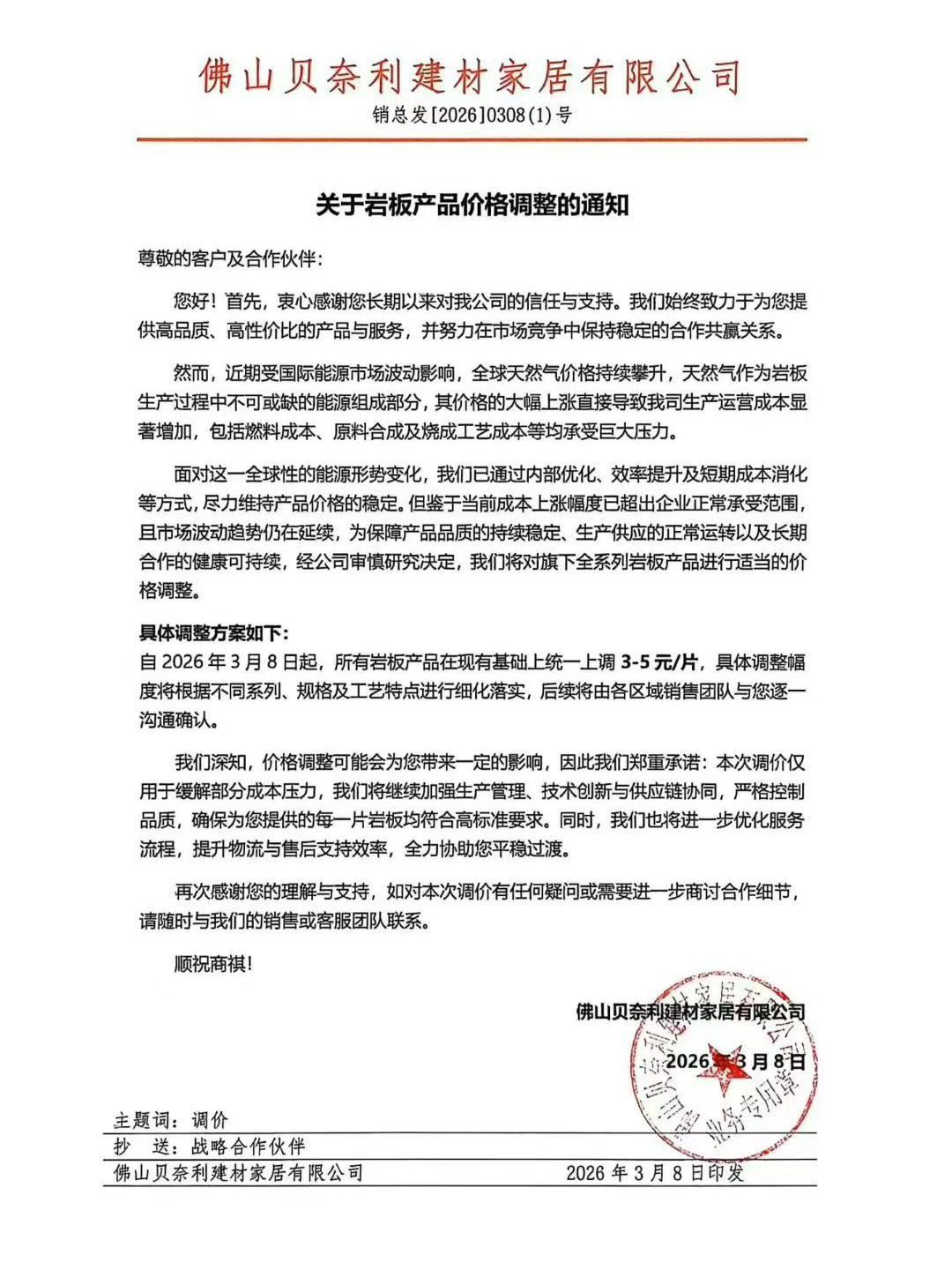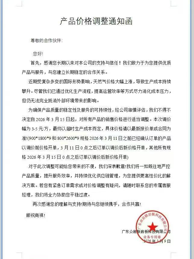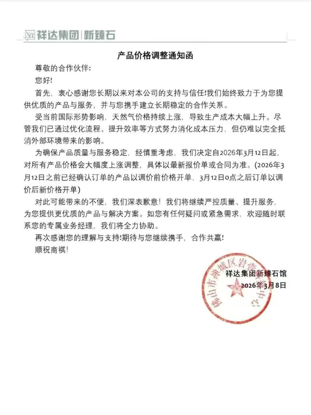 近期,广东陶瓷产区的祥达、新一派、三协、中岩、伟达、志昇、众岩联、大板智联、贝奈利等近十家陶企陆续发布涨价通知。此次涨价的起始时间主要集中在3月8日至4月1日,其涨价的产品主要涵盖瓷砖和岩板产品。比如,600×600mm、800×800mm、600×1200mm规格瓷砖产品上涨0.1-0.3元/片,岩板产品涨价幅度约为每平方米3-5元。