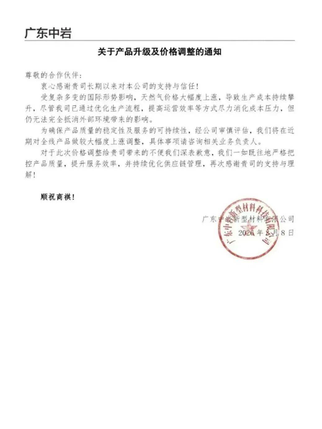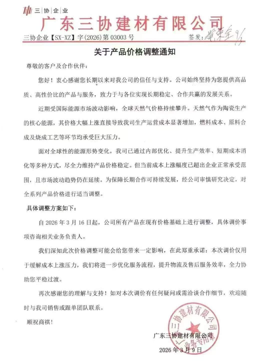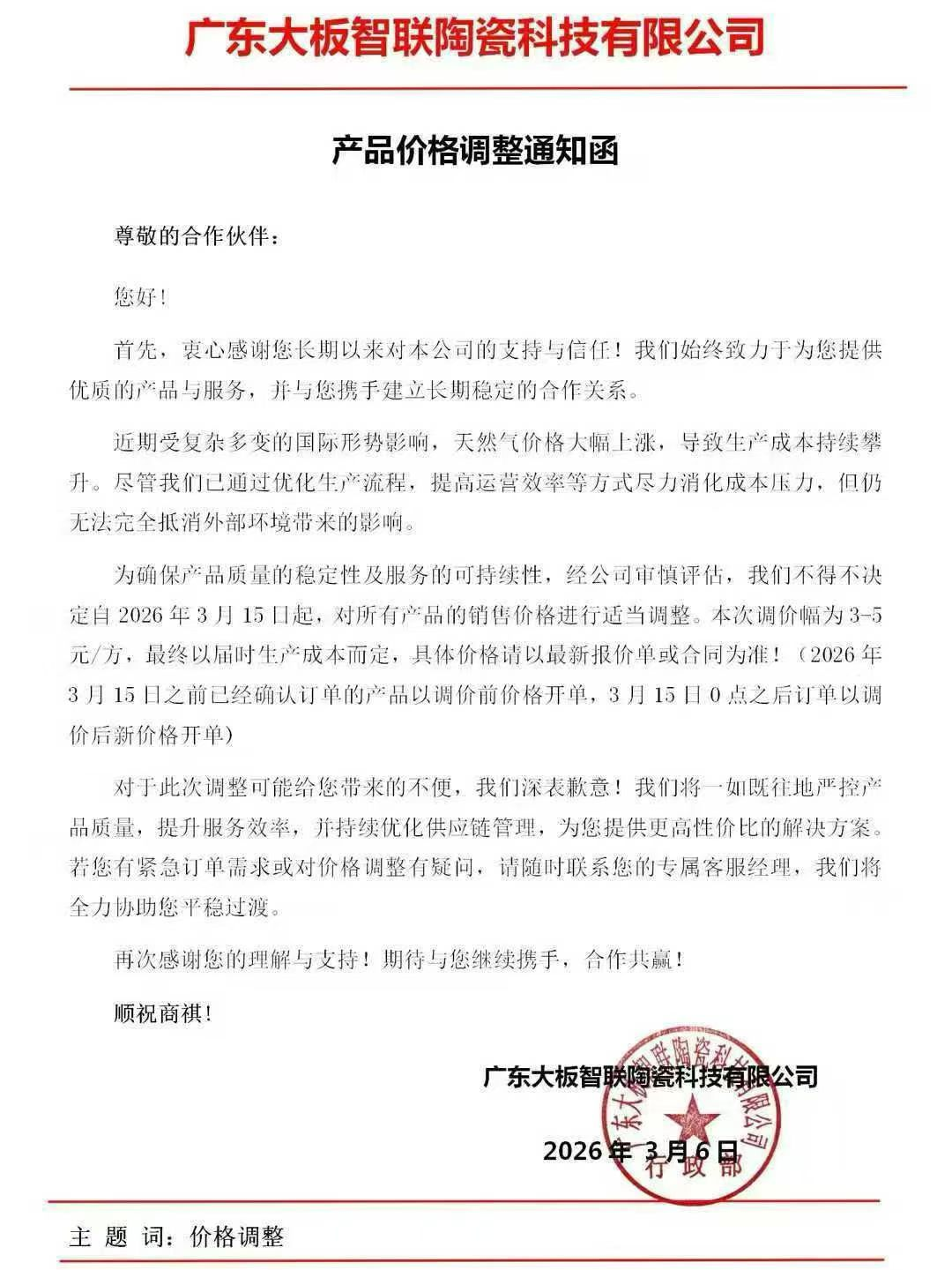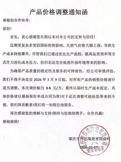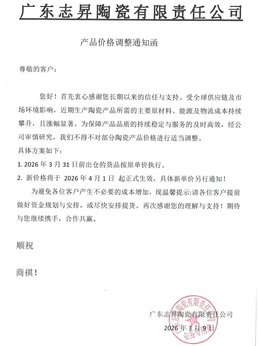 另一方面,需求端的政策性变化也在倒逼陶企涨价。根据财政部与国家税务总局发布的公告显示,自2026年4月1日起,我国将取消陶瓷砖增值税出口退税。这一短期内需求的集中释放,再加之春节后国内建材市场重启的需求,也促成了本轮瓷砖、岩板产品价格的上调。