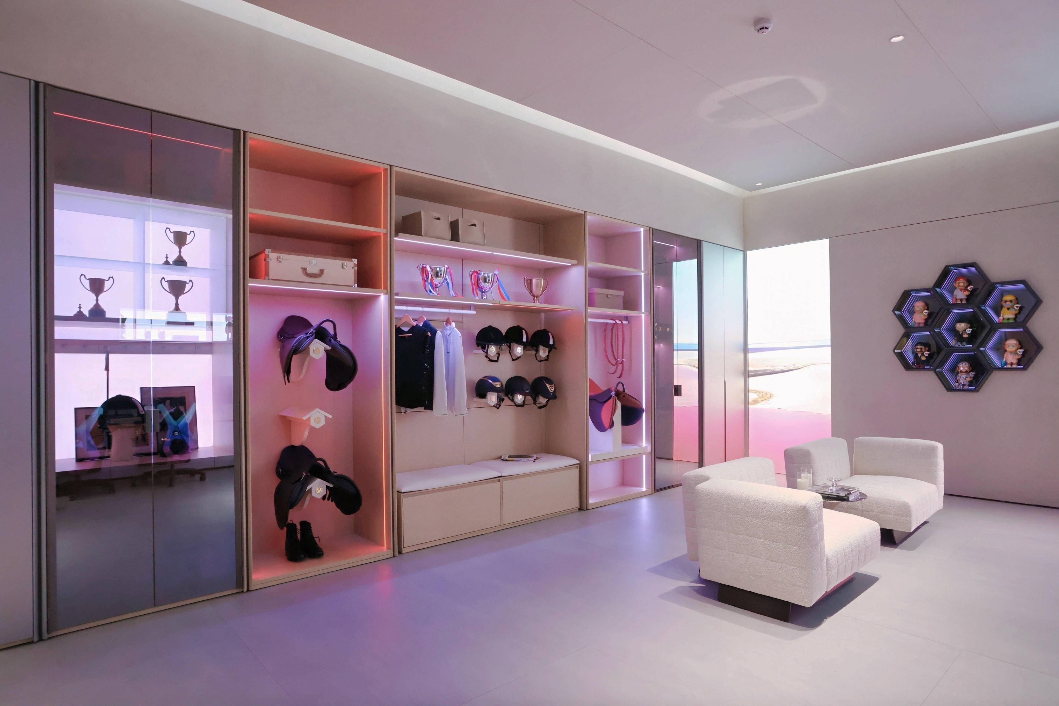兴趣空间 | 次元宇宙的声光结界。这里是对Z世代多元热爱的高光致敬,电竞、观影、手办、运动等全部容纳其中。立体灯光设计可组合N种情绪方案:骏逸模式下挑马术装备清晰可见;霆决模式下电竞区光影跃动,潮玩柜同步点亮。激光投影与幕布从柜内缓缓升起,“能量补给站”冰饮随手可取。洞洞板单孔承重20kg,健身器材轻松悬挂;多巴胺背板随音乐律动,深渊镜线条灯光让潮玩成为空间主角——这里是年轻人的声光结界,让思绪一键放空。