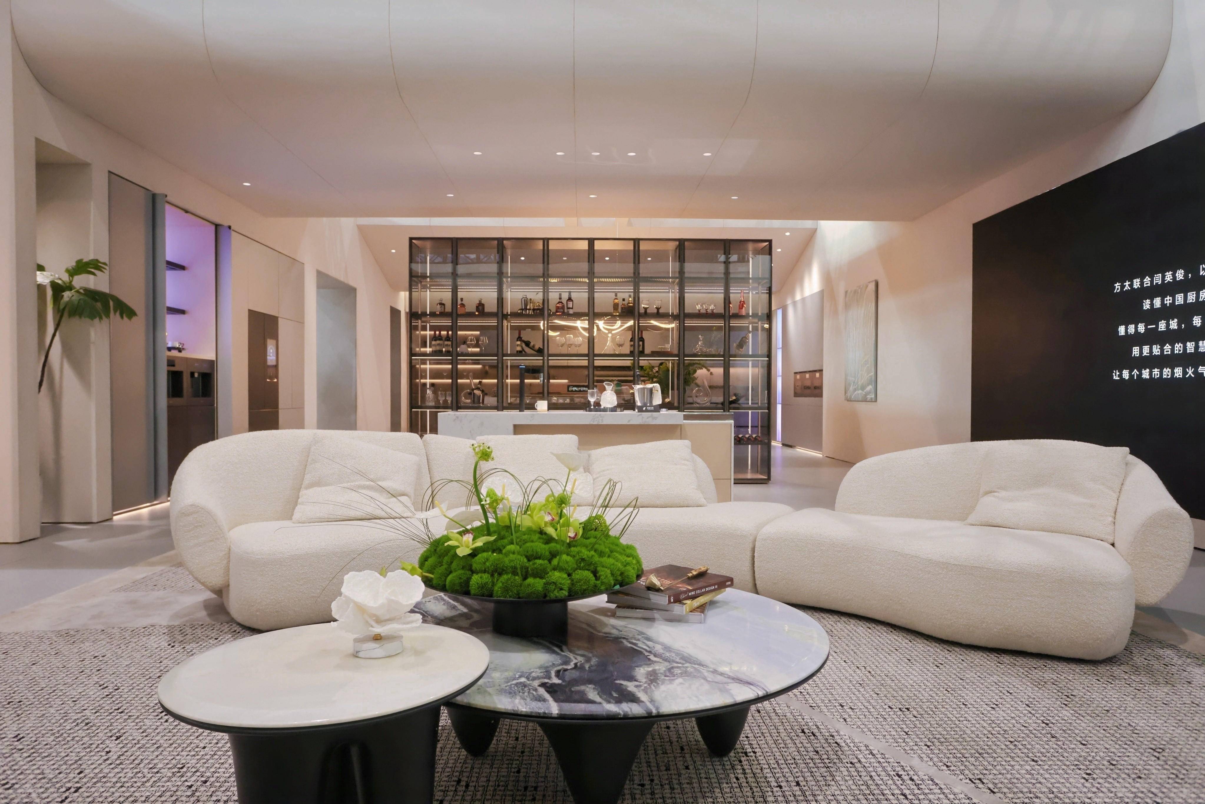 品酒区 | 悦己生活的仪式感场域。隔而不断的设计理念,由通透玻璃酒柜将社交与烟火分隔。餐边柜集成嵌入式净饮制冰机、嵌入式净饮咖啡机、方太新一代高端冰箱,提升效率和生活仪式感。酌悦模式下,主动圈出一方专属的沉浸角落,独享松弛。中岛设计隐藏式水槽及红酒雪茄收纳模块,餐边柜采用背插门设计,以“藏露有度”的克制实现功能与美学的统一。