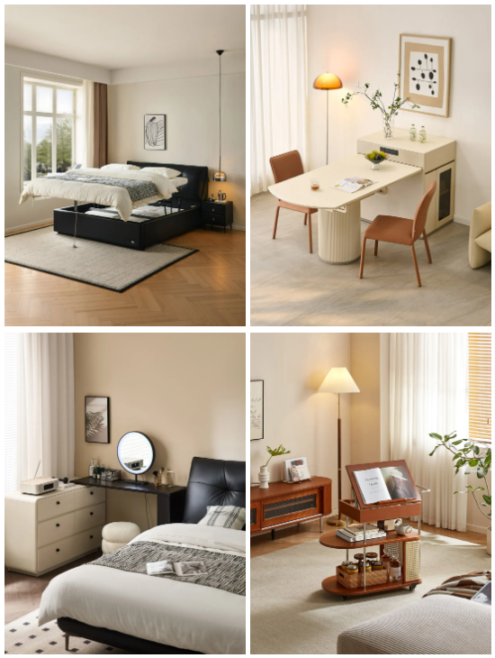 自带储物空间的箱体软床,换季被褥、行李箱轻松收纳;可折叠岛台餐桌,日常收起不占地,亲友欢聚时秒变大气餐桌,侧面预留收纳格,餐具随手可取;书桌妆台一体设计,可一字型靠墙办公,也可L型布局变身梳妆区,收纳储物一步到位;可移动小边几,客厅卧室随意切换,既是茶几又是床头柜,灵活适配每个角落。从客厅到卧室,从收纳到功能,精准破解小户型拥挤、收纳不足的痛点,真正实现小空间大利用,让家整洁有序,通透开阔。