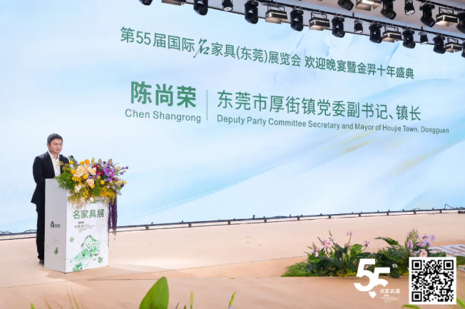 在今晚的盛典上,东莞市厚街镇党委副书记、镇长陈尚荣发表致辞。他表示,厚街与名家具展同频共振、共生共荣26年,共同推动展会从区域博览会成长为全球家居行业风向标,也助力厚街从“家具制造基地”向“全球家具产业集群高地”实现华丽蜕变。