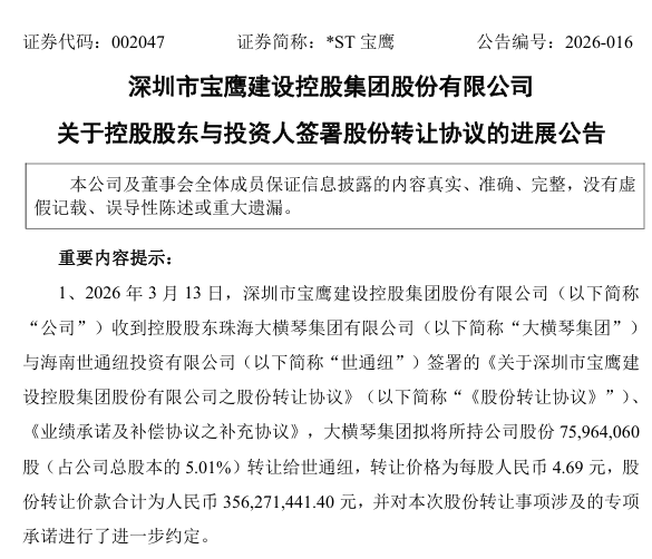 3月14日,深圳市宝鹰建设控股集团股份有限公司(简称“宝鹰股份”)发布公告,控股股东珠海大横琴集团有限公司(简称“大横琴集团”)与海南世通纽投资有限公司签署了正式的股份转让协议及相关补充协议。根据协议,大横琴集团拟将所持公司5.01%股份转让给世通纽,转让价格为每股4.69元,股份转让价款合计3.56亿元。