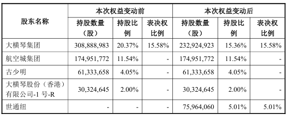 根据公告披露的股权结构,本次权益变动前,大横琴集团持有宝鹰股份20.37%股份,为第一大股东。转让完成后,大横琴集团持股比例降至15.36%,世通纽将持有5.01%股份,成为公司重要股东。