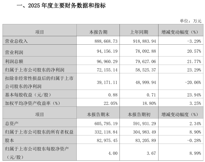 3月13日,德华兔宝宝装饰新材股份有限公司(简称“兔宝宝”)发布2025年度业绩快报。报告期内,公司实现营业收入88.87亿元,同比减少3.29%;归属于上市公司股东的净利润7.22亿元,同比增长23.29%。然而,扣除非经常性损益后的净利润为3.92亿元,同比下滑20.06%,呈现明显反差。