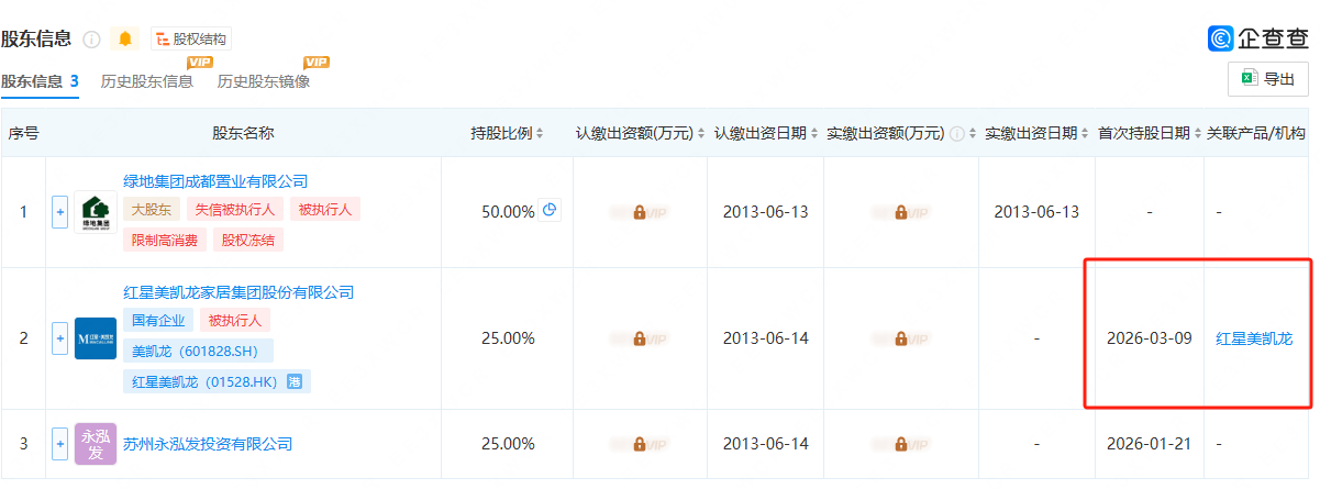 2026年1月,成都星远置业对绿地金牛的持股比例由50%下降至25.00%。3月10日成都星远置业退出了绿地金牛,美凯龙入股,成为绿地金牛的参股股东。