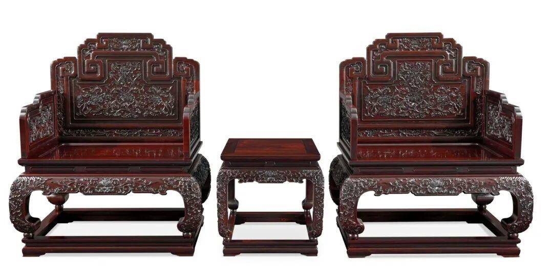 灵感源自2008年中国嘉德拍卖的清乾隆紫檀雕西香莲大平头案。整套家具设计紧随时代需求,制作技艺秉承传统精髓,袭古制之精髓,集南北之大成,历经多年方得以完成,再现了清宫御制家具的神采。这套家具采取传统纯手工雕刻方式精制而成,呈现了用料宽绰、敦厚凝重、端庄华丽、精致繁美的清宫御制家具特点。该同款宝座被故宫博物院收藏于宝蕴楼,用于重要外事接待,曾在中国国家博物馆《澄古匠心—伍炳亮家具艺术展》中展出。