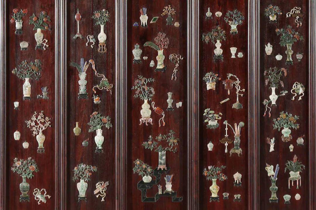 地座屏由九扇屏风组成,以小叶紫檀老料为材,镶嵌以翡翠玉石,精雕细琢。雕饰为西番莲花纹,突显原材的沉稳厚重。屏板采用的百宝嵌工艺为清代宫廷器中常见的装饰手法。百宝嵌工艺多用于漆器、硬木家具上,用于小叶紫檀上则更显珍贵。整屏古朴典雅,沉着内敛,颇具宫廷气韵。现常展于广州工美港“伍炳亮家具美学艺术空间”。