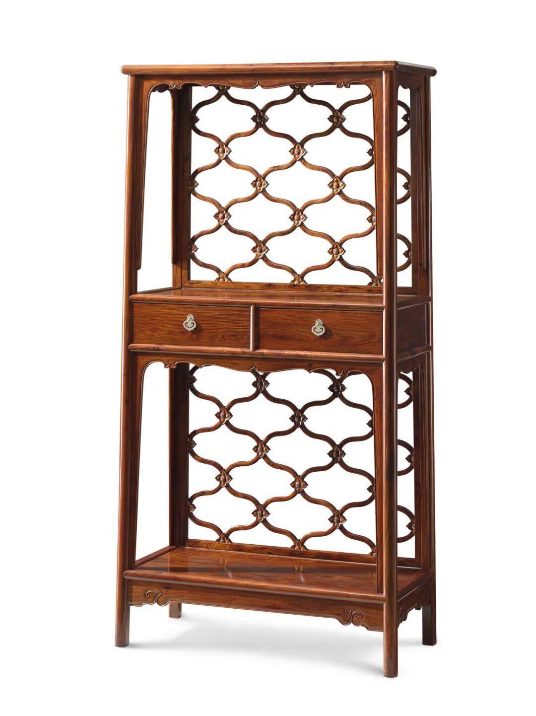 此架格上敛下舒,大小头造型。格分两层,三面装壸门券口牙子,缘边起阳线,线条劲利优美。中间双屉,屉面光素,装铜质吊牌。后背装可拆卸菱花式扇活,各攒弯材四根而组合成圆,如粼浪层层。下格底枨之下安设牙板,两头略锼云纹,呼应壶门券口牙子。