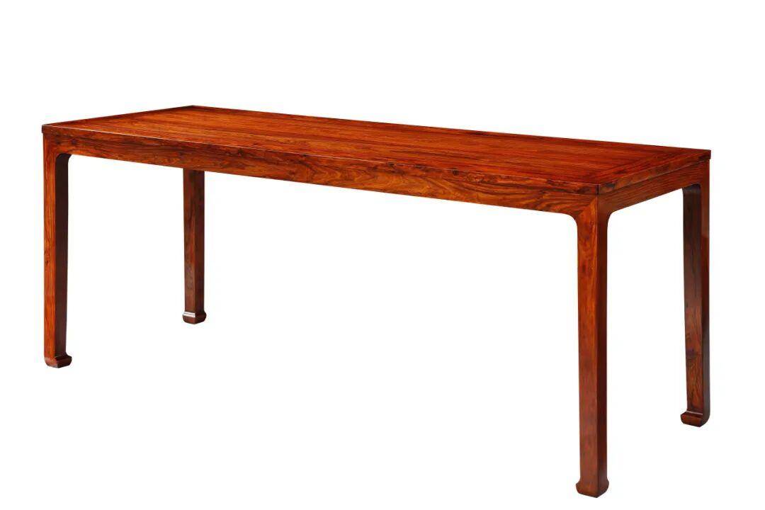 桌体假四面平式,边抹与牙条、腿足看似齐平,实际面稍微突出微小。桌面为格角榫攒边框,平镶双拼厚面板,面板与边框几乎同厚相平。面心板木纹生动,面低保留了原木料天然样貌,因为板厚约3公分下装只需两条根穿带出梢支承。牙条背面装燕尾形穿销,上贯边框底部,使牙条固定贴紧。方形腿,马蹄足。此桌选料精美,工艺精湛,造型精练。