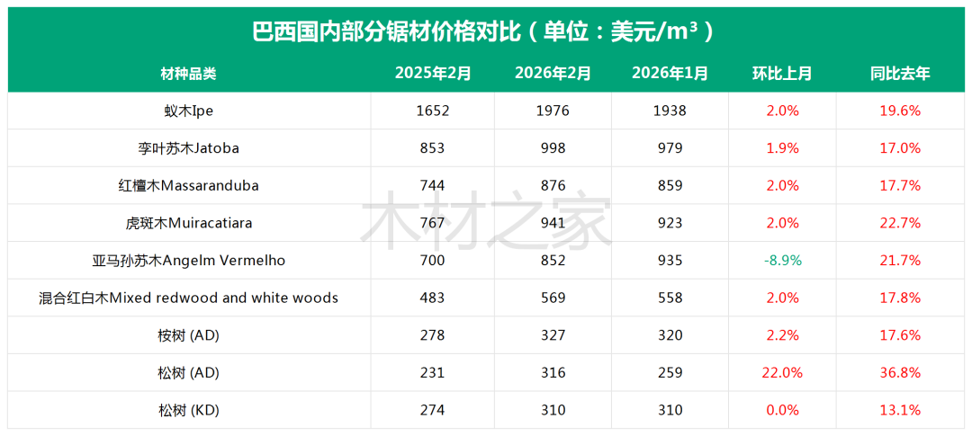 2月,巴西木材市场再现强劲涨势,原木与锯材价格同步上行,部分热门品种同比涨幅逾36%。