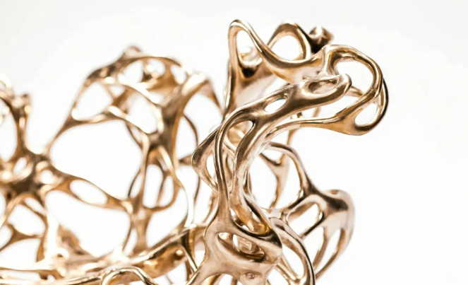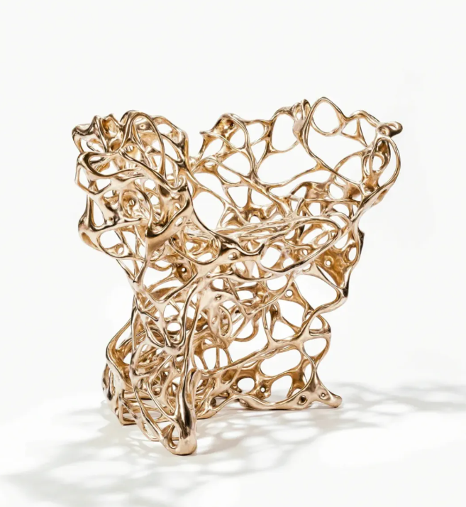 在造型上,Growth椅呈现出枝蔓般交织的网络结构,线条不断分裂、延展并重新汇合,形成富有张力的空间骨架。它没有明显的对称轴,却保持着稳定与平衡,仿佛自然界中树根或珊瑚的生长逻辑。材质方面,这件作品采用金属3D打印技术制造,随后经过表面处理,呈现出细腻而坚固的质感。金属的强度保证了承重性能,而复杂的孔隙结构则带来轻盈的视觉效果,使坚硬的金属呈现出近似生物体的柔韧观感。