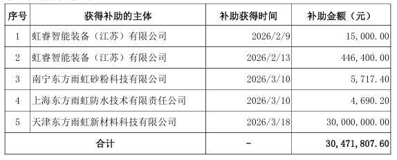 从补助明细来看,除天津东方雨虹新材料科技有限公司获得的3000万元大额补助外,虹睿智能装备(江苏)有限公司分别于2月9日、2月13日获得1.5万元和44.64万元补助,南宁东方雨虹砂粉科技有限公司于3月10日获得5717.4元补助,上海东方雨虹防水技术有限责任公司同日获得4690.2元补助。