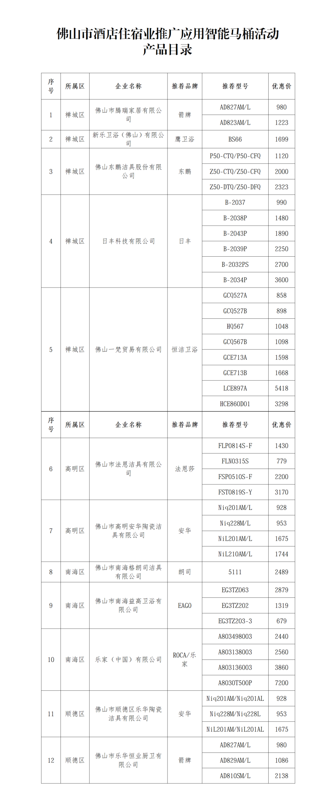 近日,佛山市正式启动酒店住宿业推广应用智能马桶资金补贴申报工作。本次活动以“政府补贴+企业让利”的双重优惠模式,面向全市酒店、民宿、营地等住宿业主体,提供低至2.6折的专属优惠采购价及最高1800元/套的政府补贴,单个住宿业主体累计补贴上限可达50万元。