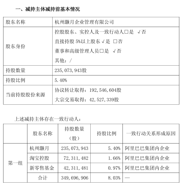 此外,杭州灏月的一致行动人淘宝控股及新零售基金已在此前完成其持有的公司全部H股股份的减持,不再持有公司股份。