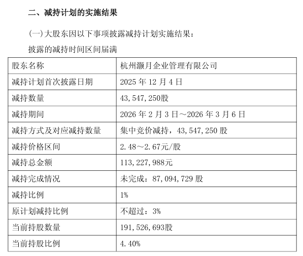 根据公告,杭州灏月原计划通过集中竞价和大宗交易方式减持不超过130,641,979股公司股份,占总股本的3%。实际减持期间为2026年2月3日至2026年3月6日,杭州灏月通过集中竞价方式累计减持43,547,250股A股股份,约占公司总股本的1%,减持总金额为113,227,988元。减持后,杭州灏月持有公司股份191,526,693股,占总股本的4.4%。