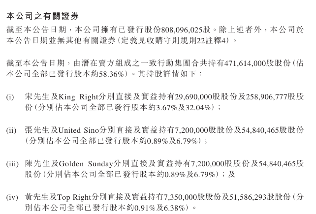 截至公告日,潜在卖方一致行动集团合计持有4.72亿股,持股比例约58.36%。其中,宋启庆及King Right合计持股约35.71%,张港璋及United Sino合计持股约7.68%,陈国坚及Golden Sunday合计持股约7.68%,黄伟业及Top Right合计持股约7.29%。