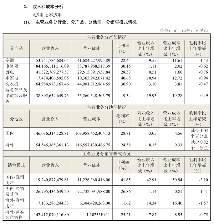细分产品方面,空调、水家电业务收入增速较快,均在10%左右;电冰箱、洗衣机、厨电等业务增速相对平稳。