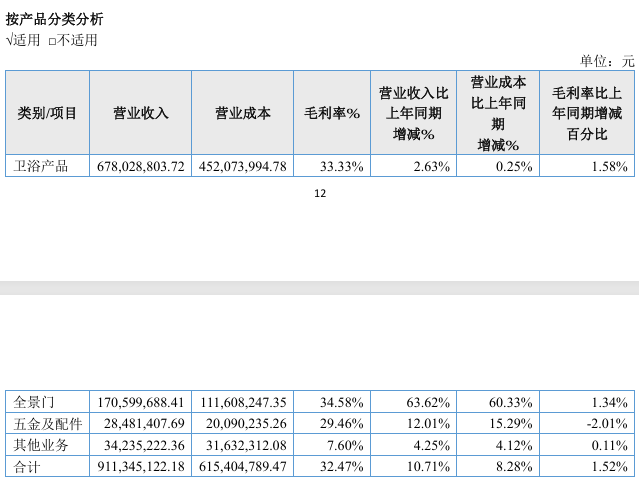 从产品结构看,卫浴产品实现收入6.78亿元,同比增长2.63%,毛利率33.33%;全景门业务表现尤为亮眼,实现收入1.71亿元,同比大幅增长63.62%,毛利率34.58%,同比提升1.34个百分点;五金及配件收入2848.14万元,同比增长12.01%。公司表示,全景门收入增长主要系大宗业务渠道推广取得明显进展,项目落地效果显著。