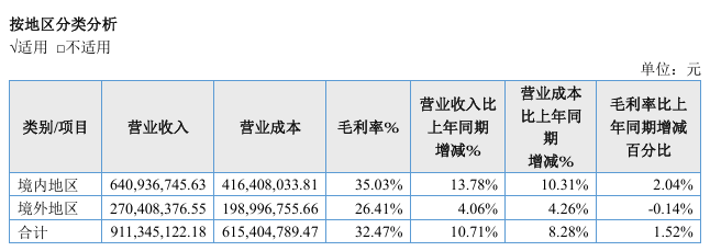 从区域分布看,境内地区收入6.41亿元,同比增长13.78%,毛利率35.03%;境外地区收入2.7亿元,同比增长4.06%,毛利率26.41%。公司销售模式涵盖零售业务、大宗业务和出口业务,三种模式收入结构较为均衡。
