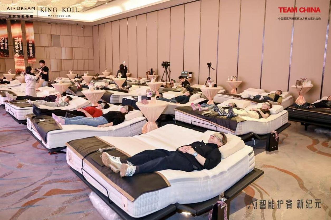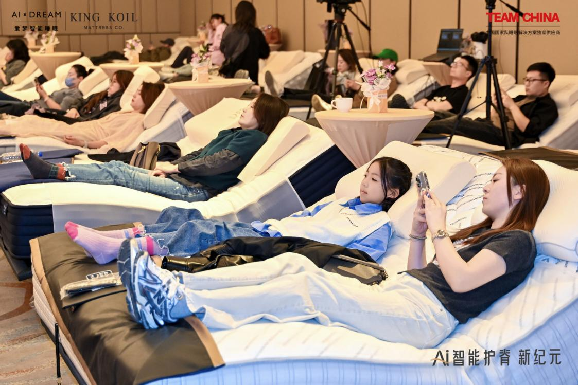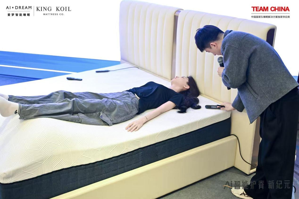最后,令人期待的“冠军同款”体验环节在热烈的掌声中展开。金可儿护脊睡眠体验官胡麟鹏在工作人员协助下,与不久前在展会上“公测亮相”的智能床垫来了场“深度对话”,随着智能床垫犹如波浪曲线的自如起伏,胡麟鹏直言感受到了如在训练场理疗师的同款「放松拉伸」——“它能应对我赛场与生活的“AB面”来提供不同的支撑感,这真是太对味了!”
