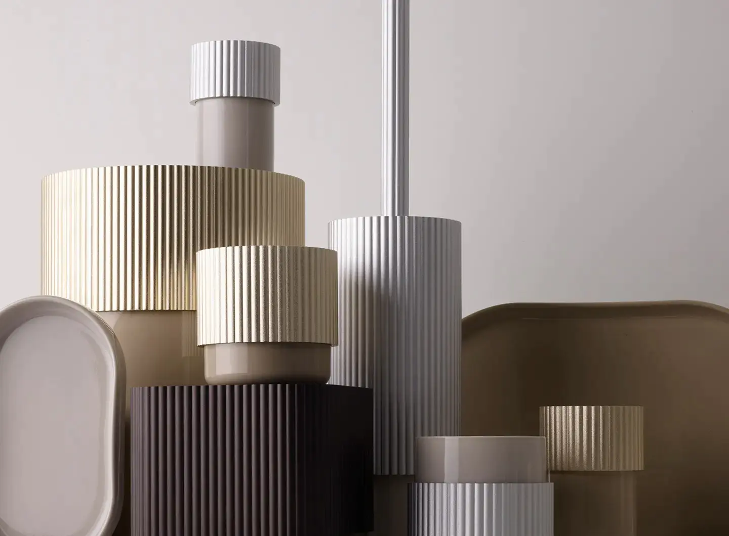 由 Sebastian Herkner 为 Decor Walther 设计的 OF.LINE 系列结合了铝材和手工瓷。分装瓶、碗、毛巾架和托盘变成了具有强大美学冲击力的功能性元件,冷热表面的对比将每个组件都转化为一个小型的设计物件。