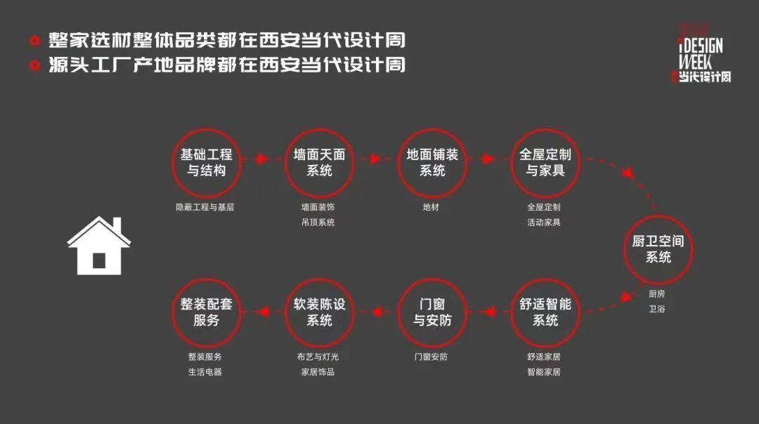 整家选材整体品类、源头工厂、产地品牌都在西安当代设计周,包含:“基础工程与结构—墙面天面系统—地面铺装系统—全屋定制与家具—厨卫空间系统—舒适智能系统—门窗与安防—软装陈设系统—整装配套服务”全供应链,实现“外装-内装-后装”超全供应链和服务链的无缝衔接。
