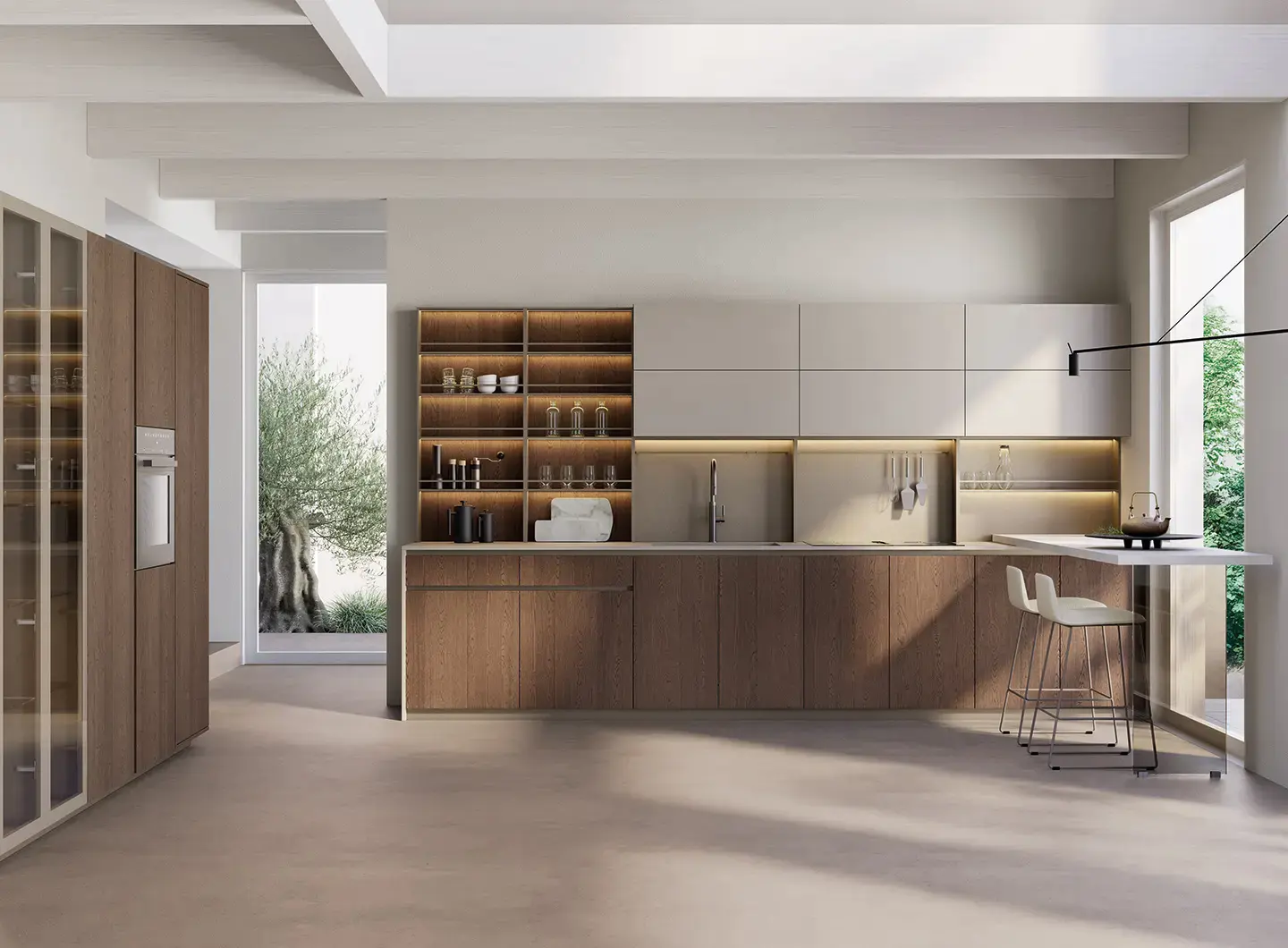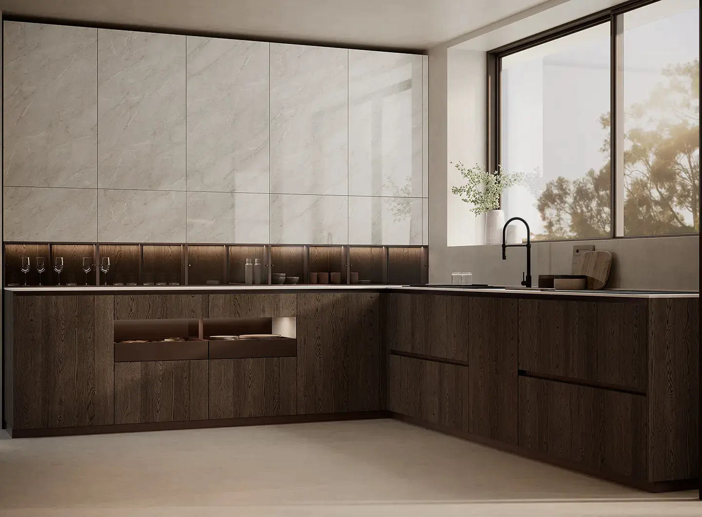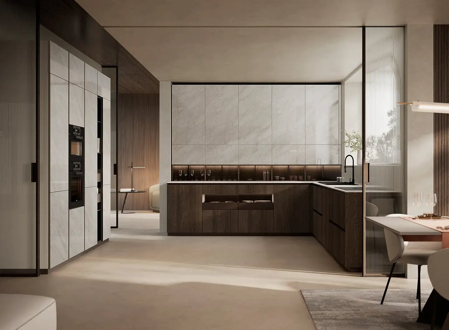 Shade Lab系列以创新饰面强化当代特质,围绕“材料与光的对话”展开:带Salomé大理石效果的亮面壁柜与立柱,优雅明亮,与烟熏橡木贴面地柜结合,在反光表面与自然纹理间形成和谐对比。呈现一组精致而宜人的氛围——亮光表面放大光线,木材恢复深度与真实感,诠释了当代厨房“美学、科技与舒适共存”的个性空间。