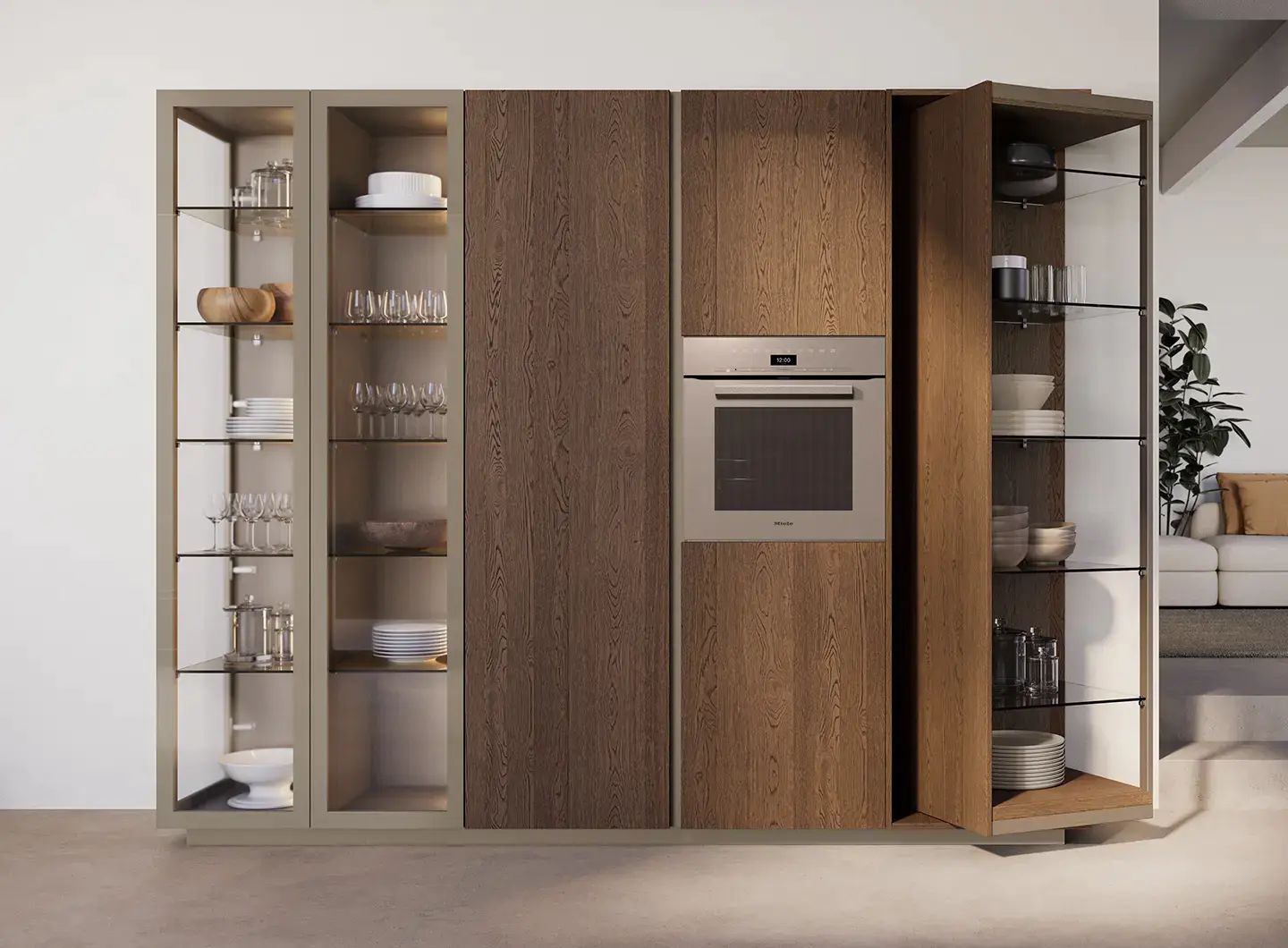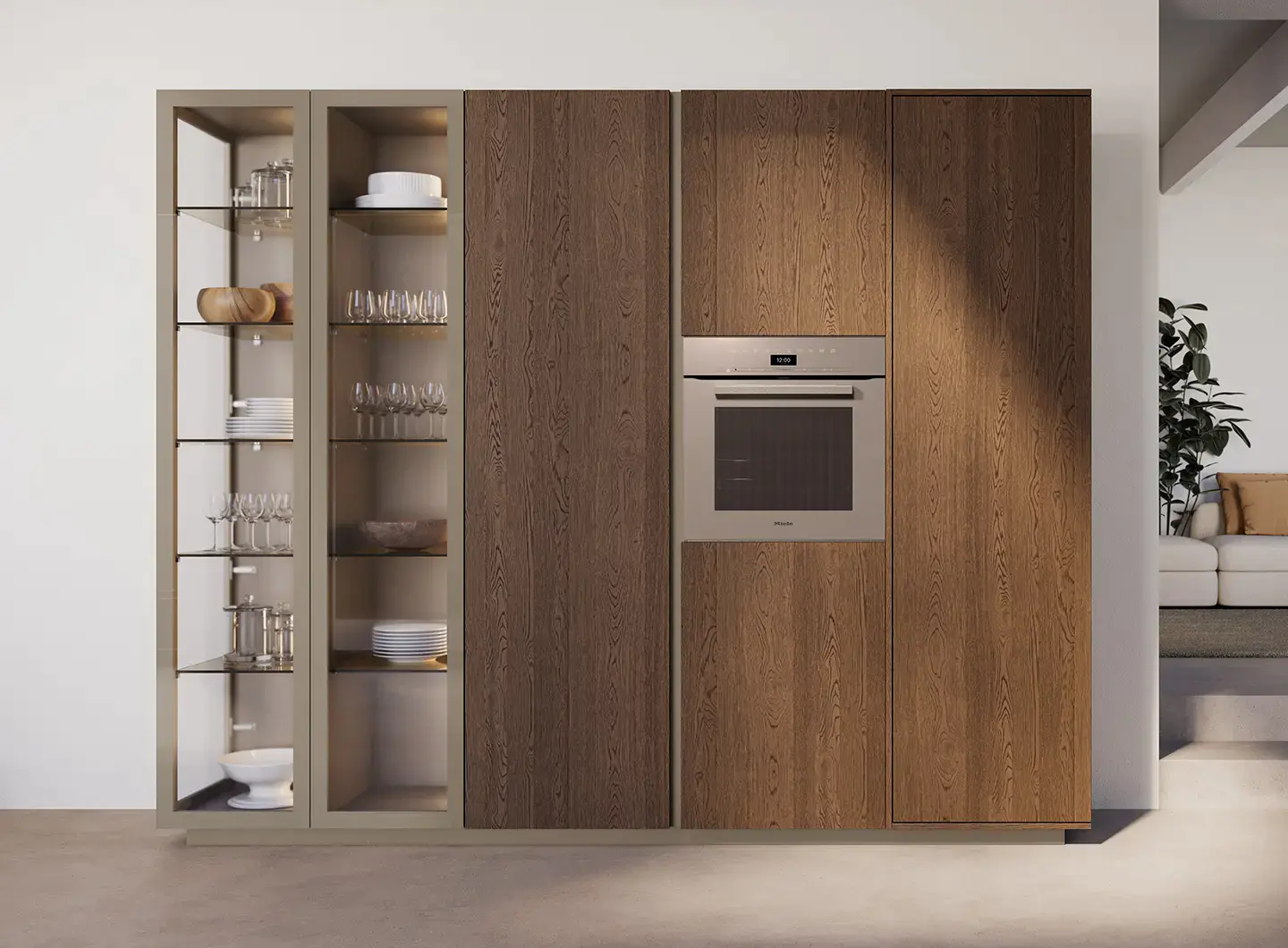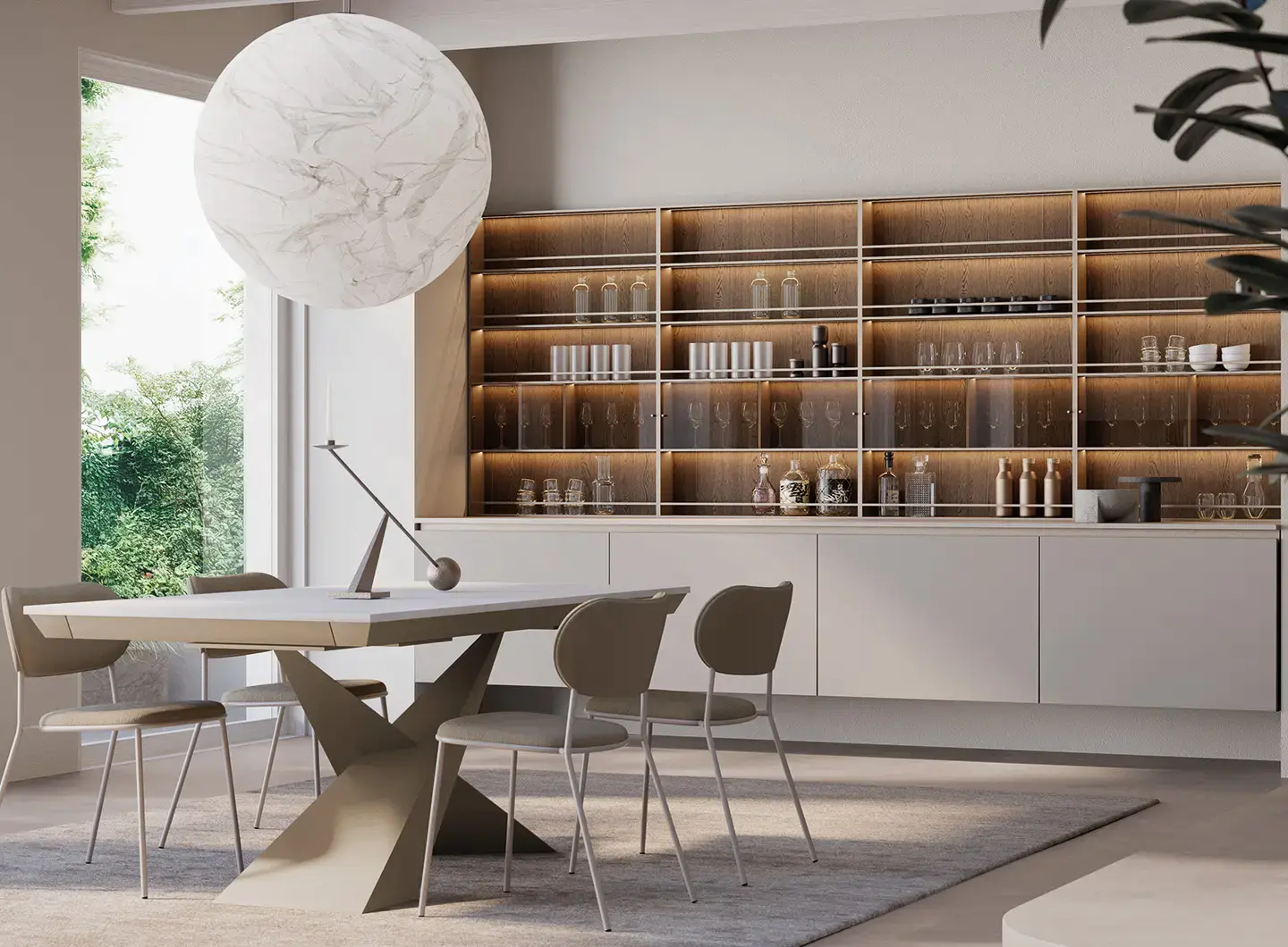 Shade Lab系列以创新饰面强化当代特质,围绕“材料与光的对话”展开:带Salomé大理石效果的亮面壁柜与立柱,优雅明亮,与烟熏橡木贴面地柜结合,在反光表面与自然纹理间形成和谐对比。呈现一组精致而宜人的氛围——亮光表面放大光线,木材恢复深度与真实感,诠释了当代厨房“美学、科技与舒适共存”的个性空间。