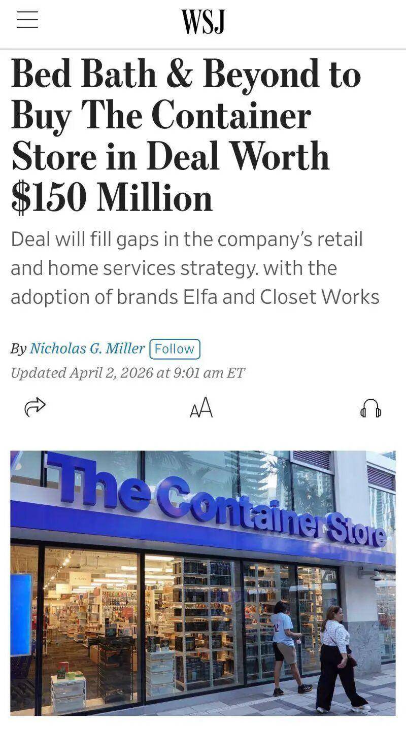 Bed Bath & Beyond斥资1.5亿美元收购The Container Store及其旗下品牌,计划整合门店与业务,通过多品牌协同实现成本节约,向综合家居服务零售转型。