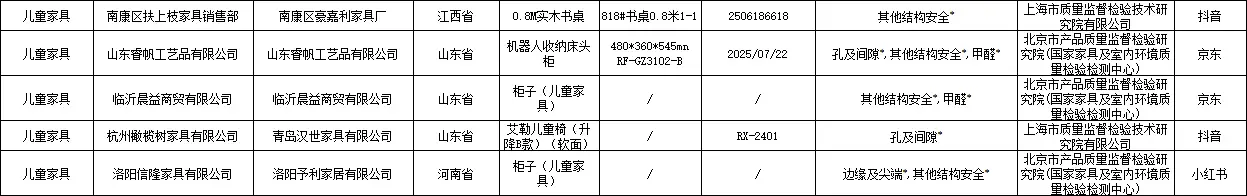 从不合格项目看,17批次产品孔及间隙不合格、15批次其他结构安全不合格、11批次甲醛不合格、7批次底座静载荷试验不合格、3批次边缘及尖端不合格,均为安全项目。此外,4批次产品未标注厂名厂址,1批次产品标注的厂名厂址不存在,已交由属地市场监管部门处理。