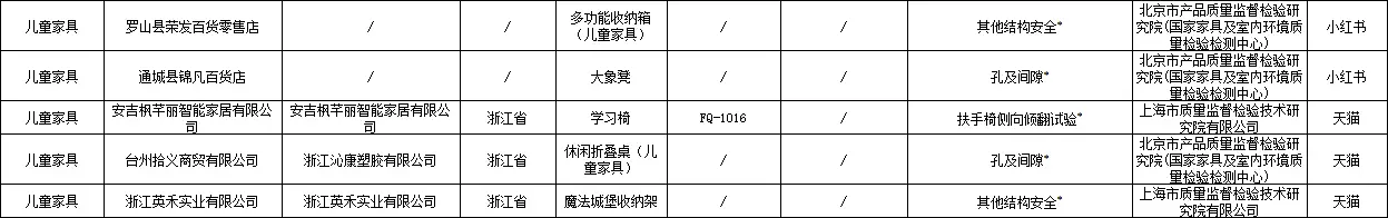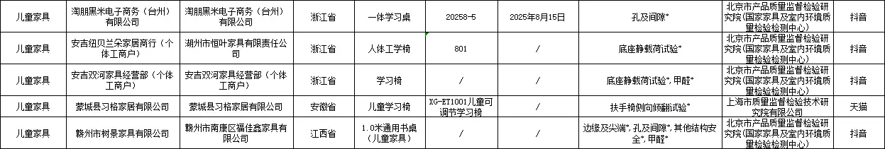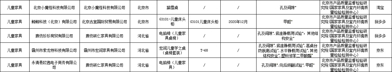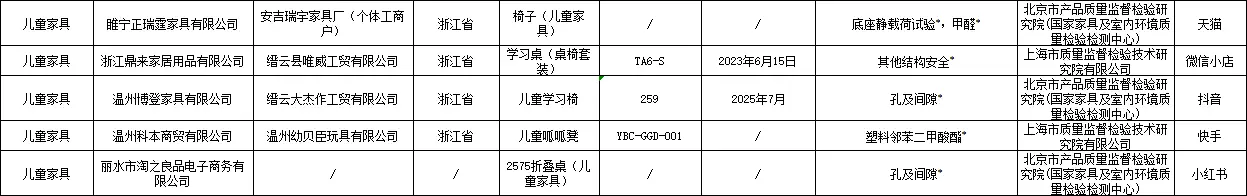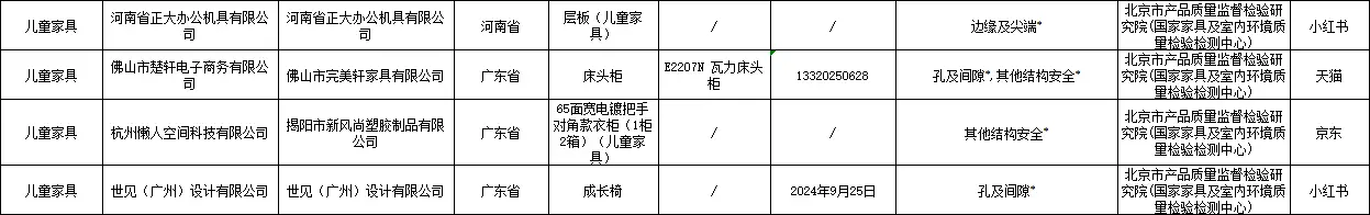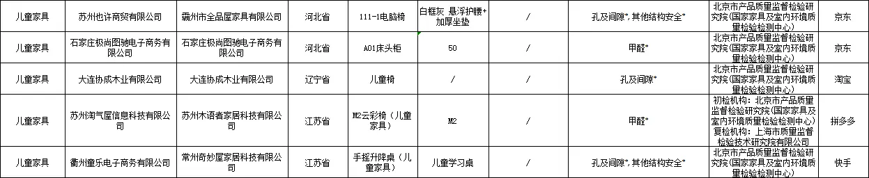 其他被通报的不合格产品还包括:江西金锐教育设备有限公司的儿童学习椅、徐州优普供应链管理有限公司的书桌、石家庄艾美家具有限公司的椅子、佛山市禧慕家具有限公司的床、北京小魔怪科技有限公司的踏雪桌、苏州木语者家居科技有限公司的M2云彩椅、常州奇妙屋家居科技有限公司的手摇升降桌、武进区横林晓宇办公家具厂的柜子、安吉蜗牛家居有限公司的儿童学习椅、温州幼贝臣玩具有限公司的儿童呱呱凳(检出塑料邻苯二甲酸酯不合格)、山东睿帆工艺品有限公司的机器人收纳床头柜、临沂晨益商贸有限公司的柜子、青岛汉世家具有限公司的艾勒儿童椅、洛阳予利家居有限公司的柜子、河南省正大办公机具有限公司的层板、佛山市完美轩家具有限公司的床头柜、揭阳市新风尚塑胶制品有限公司的65面宽电镀把手对角款衣柜、世见(广州)设计有限公司的成长椅等。