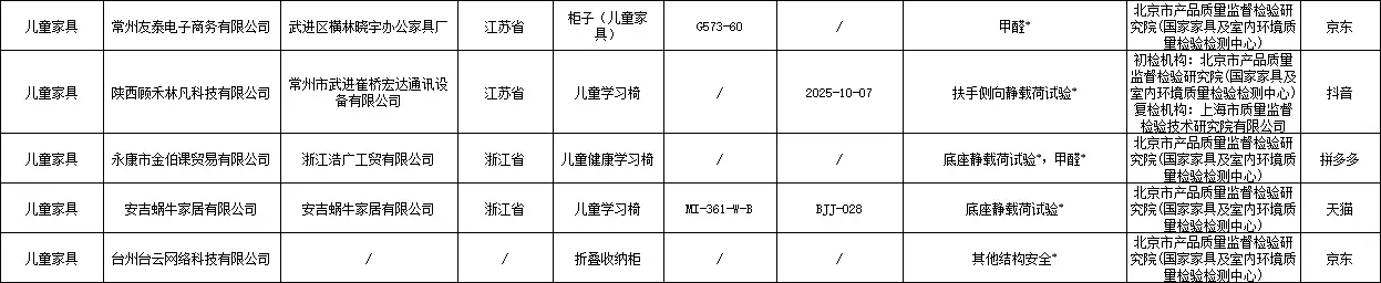 本次抽查涉及的不合格产品标称生产企业及品牌分布广泛。其中,北京古宜国际贸易有限公司生产的“G3101儿童床头柜”因甲醛项目不合格被通报。蒙城县习格家居有限公司生产的“XG-ET1001儿童可调节学习椅”因扶手椅侧向倾翻试验不合格上榜。浙江英禾实业有限公司生产的“魔法城堡收纳架”因其他结构安全不合格被点名。