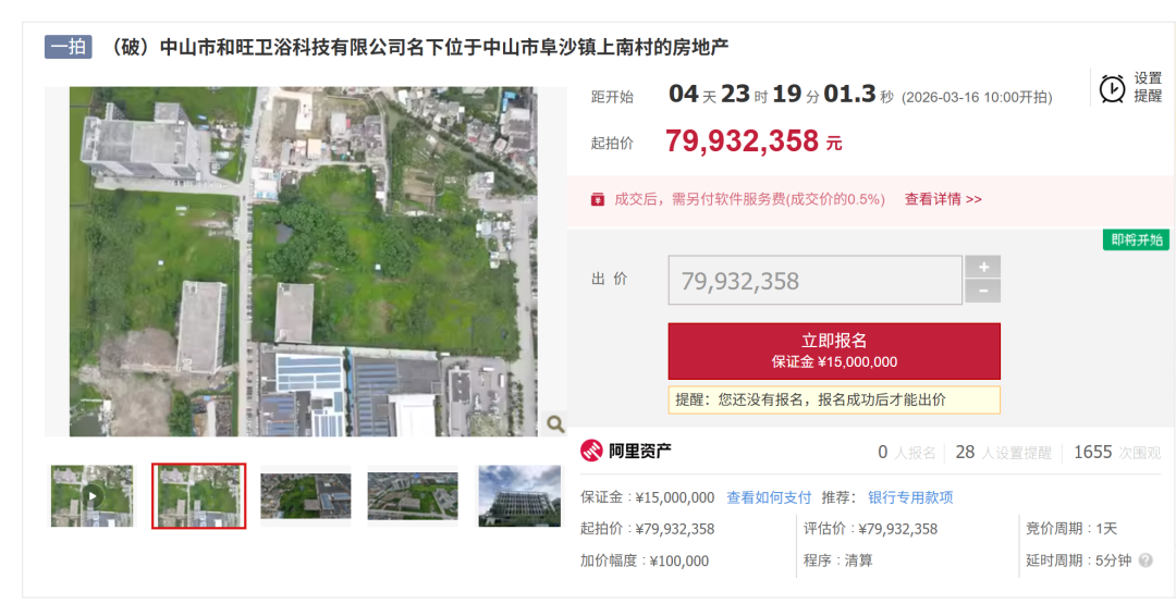 近日,在阿里拍卖平台上,中山市和旺卫浴科技有限公司名下位于阜沙镇上南村的房地产项目完成第二次司法拍卖。该项目以6394.5886万元的起拍价成交,仅有一名竞买人报名并底价竞得,意味着这处闲置多年的烂尾工业地产有望迎来重启。