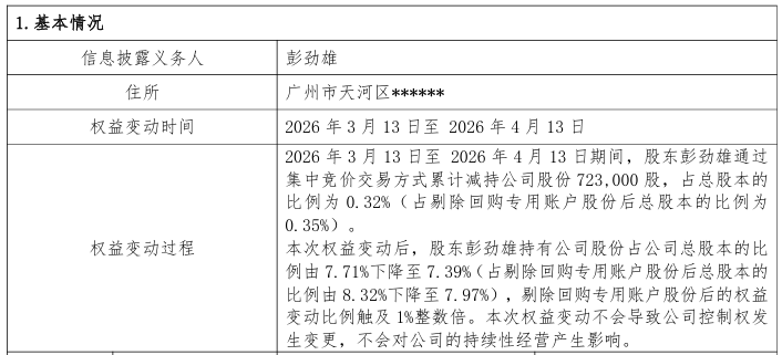 4月14日,广州尚品宅配家居股份有限公司(简称“尚品宅配”)发布公告称,公司持股5%以上股东彭劲雄于2026年3月13日至4月13日期间,通过集中竞价交易方式累计减持公司股份72.3万股,占剔除回购专用账户股份后总股本的0.35%。本次减持后,彭劲雄的持股比例由8.32%下降至7.97%,触及1%整数倍的权益变动披露红线。