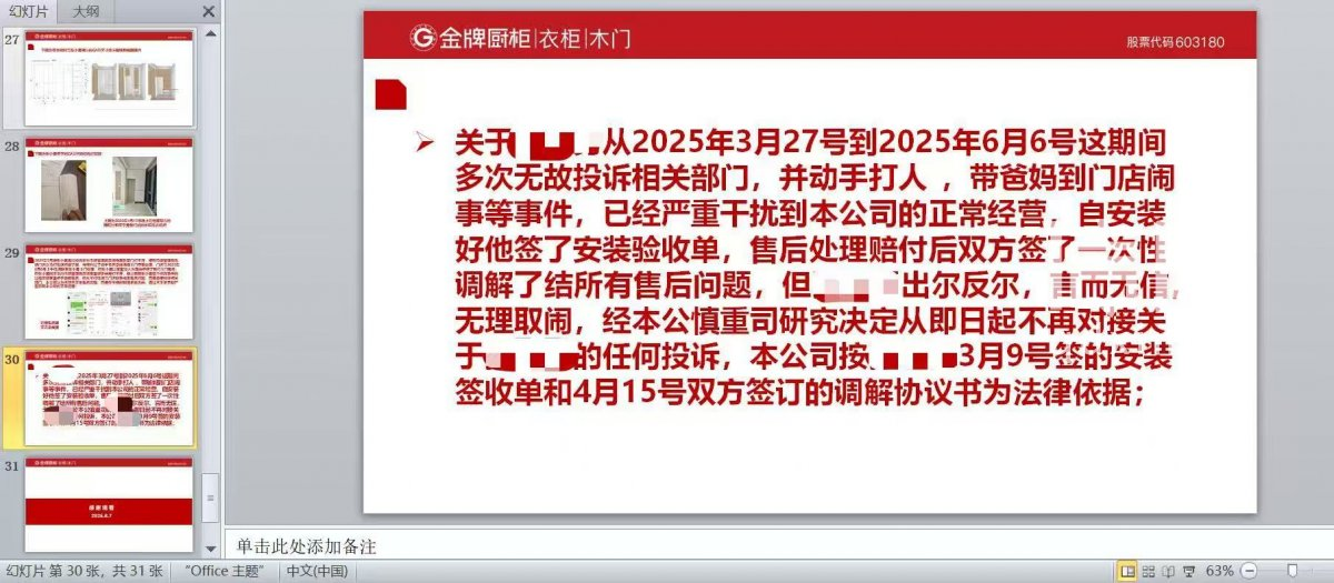 张先生发帖的目的,是希望商家重视他的诉求,尽快帮他解决问题。当记者联系到金牌整家定制时,商家发来了一份31页的PPT文件,细数2025年3月至6月期间与张先生的矛盾。
