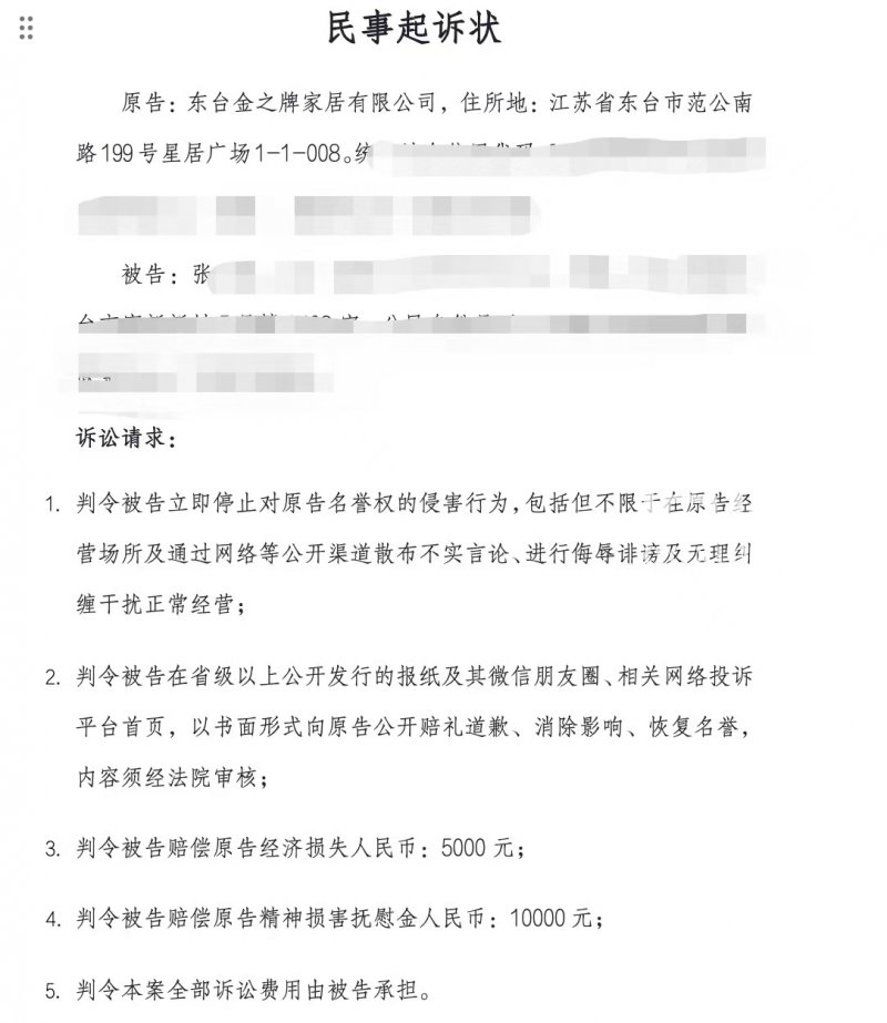 但双方签订协议后,张先生又产生了新的投诉,并且在社交平台上发了帖子。“他不仅自己发帖,而且还在我们品牌的多个视频下面发评论。”鉴于张先生的这些行为已经对自身的名誉权造成了损害,金牌整家定制于2026年3月向江苏省东台市人民法院寄送了起诉状。