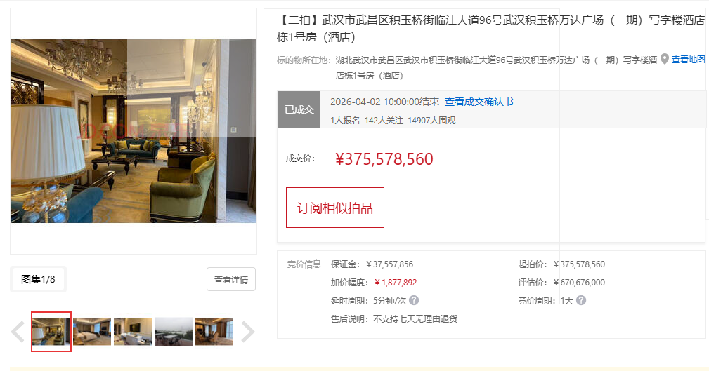 4月初,京东拍卖平台一宗酒店资产的线上竞拍落槌。宁波江东现代机电物资市场发展有限公司以3.75亿元的价格,将武汉富力威斯汀酒店收入囊中。