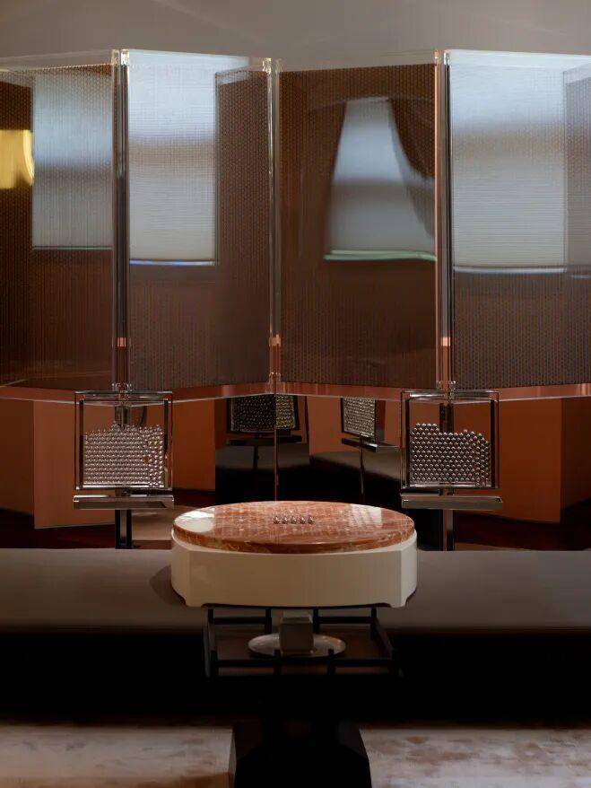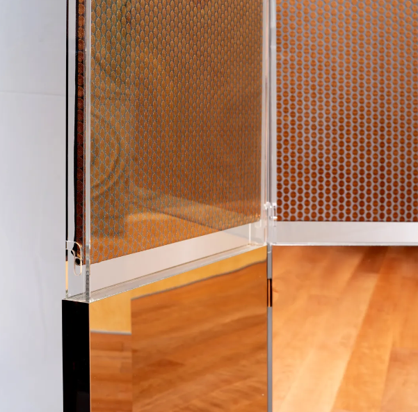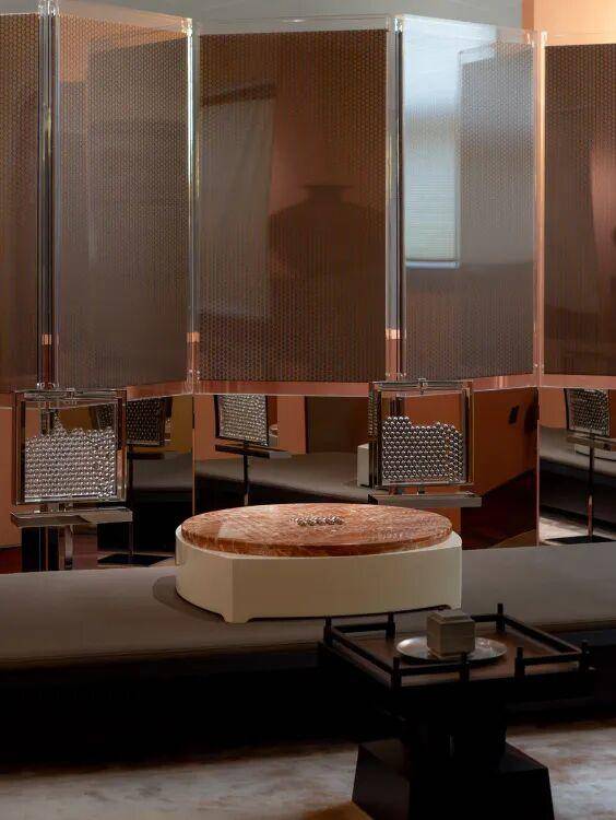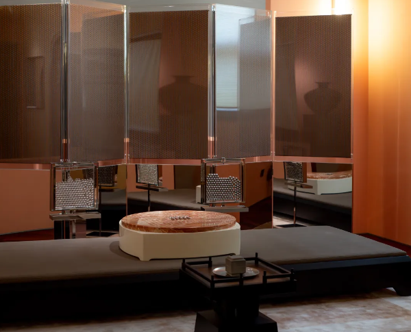 「天倪屏风」作为空间的边界与过渡,并非简单的遮挡,而是一种“气”的组织方式。其形式延续东方传统围合逻辑,以简化的结构与富有光泽感的材料进行重构,如透明亚克力、抛光不锈钢、丝质织物等。开合之间,形成流动的秩序,为对弈营造出相对独立而内敛的精神场域。