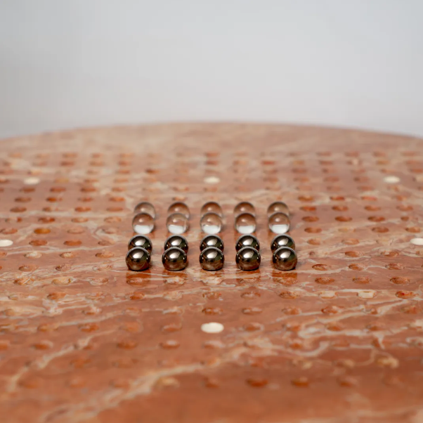 「天倪棋盘」的设计灵感源自良渚文化中的玉琮,并在此基础上进行反转与演化:基座外方内圆,棋盘则外圆内方,方与圆相互嵌套,打破了传统围棋的视觉经验,使对弈不再只是技艺的展开,而成为一场具有仪式感的精神活动。天然大理石案面与白色基座形成对比,表达丰富肌理和留白之间的平衡。与棋盘配套的「天倪棋子装置」,令棋子不再仅作为对弈工具存在,而被转化为一种可感知的“物”。它的纵向盛放形制与材质触感,让“存”与“取”、“落”与“置”被强调,在行为与观念之间形成双向的转译表达。