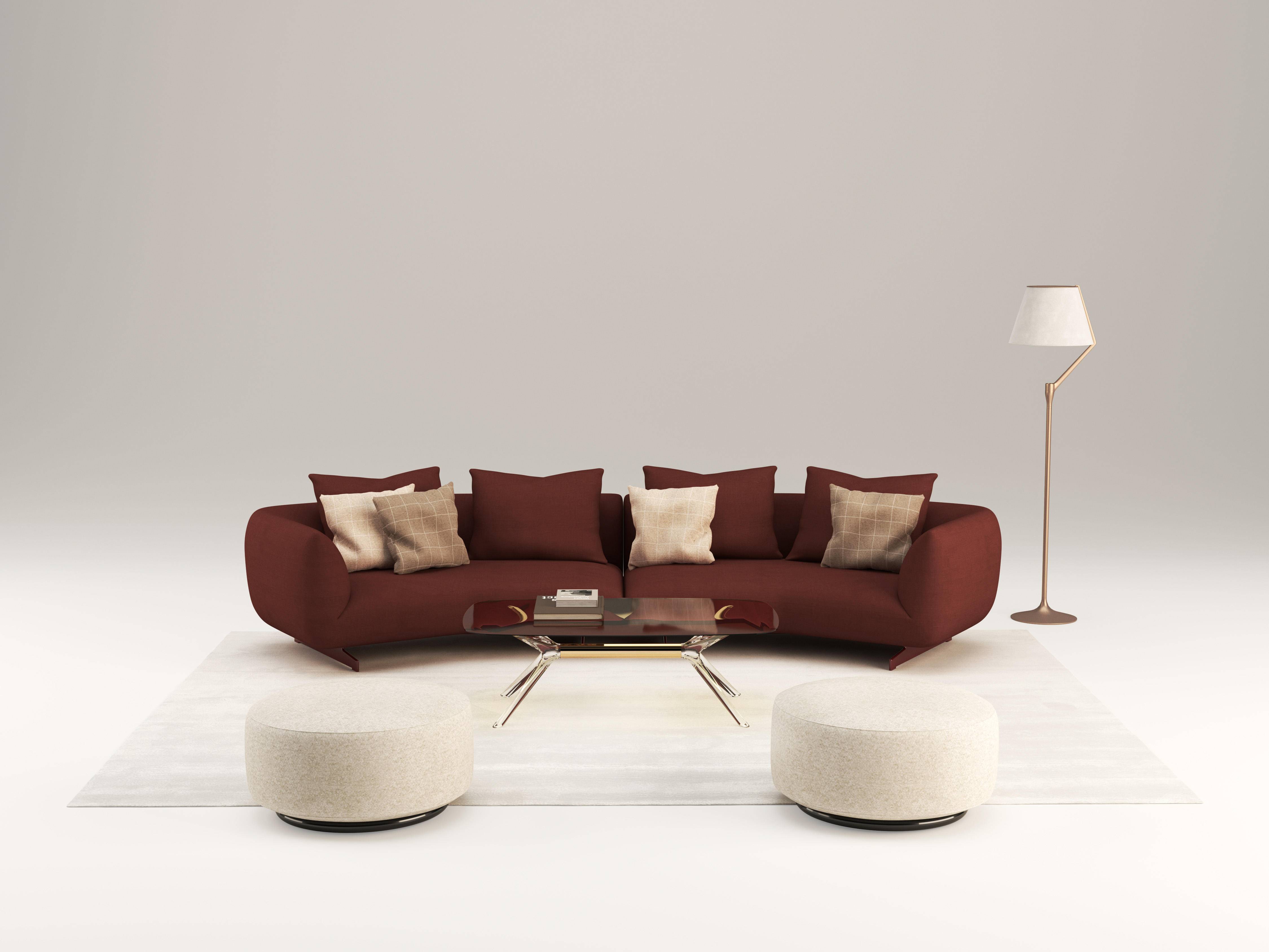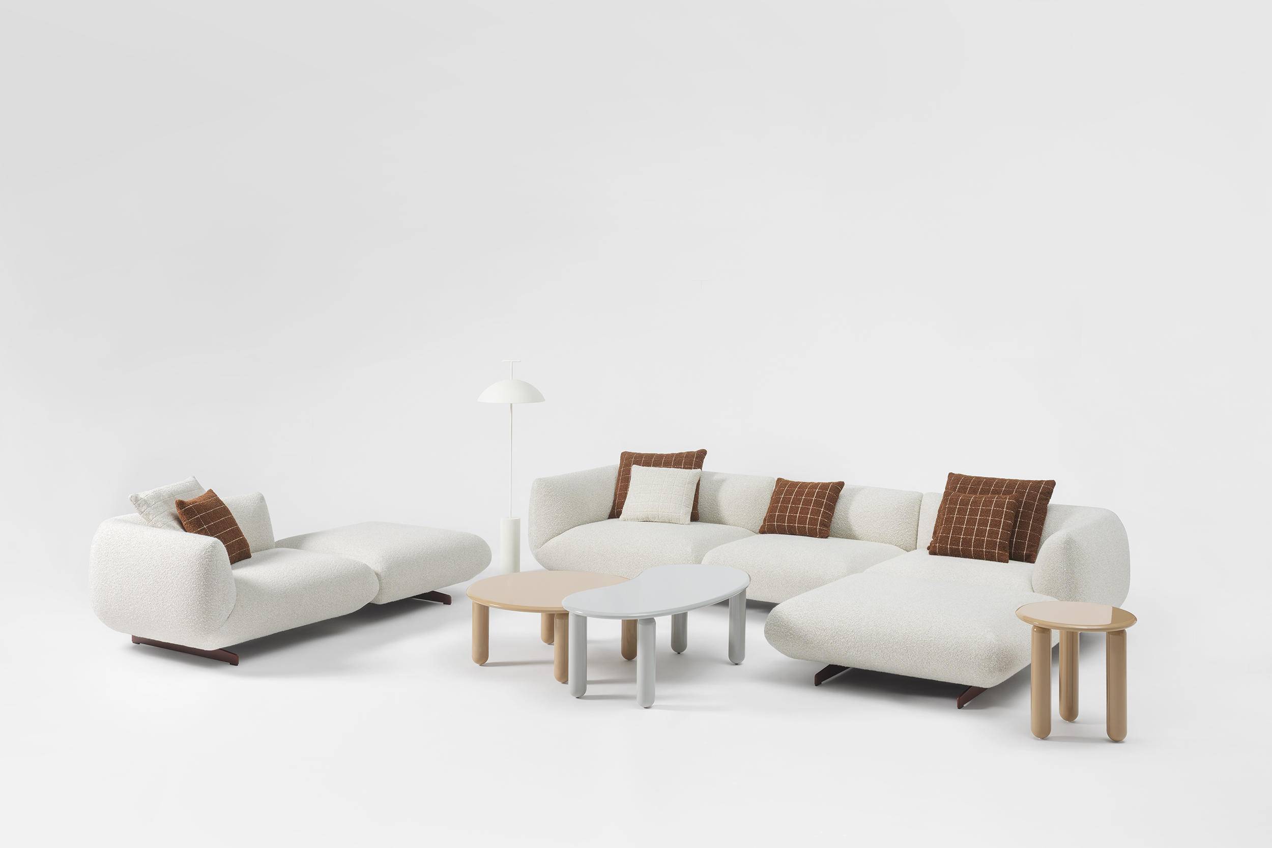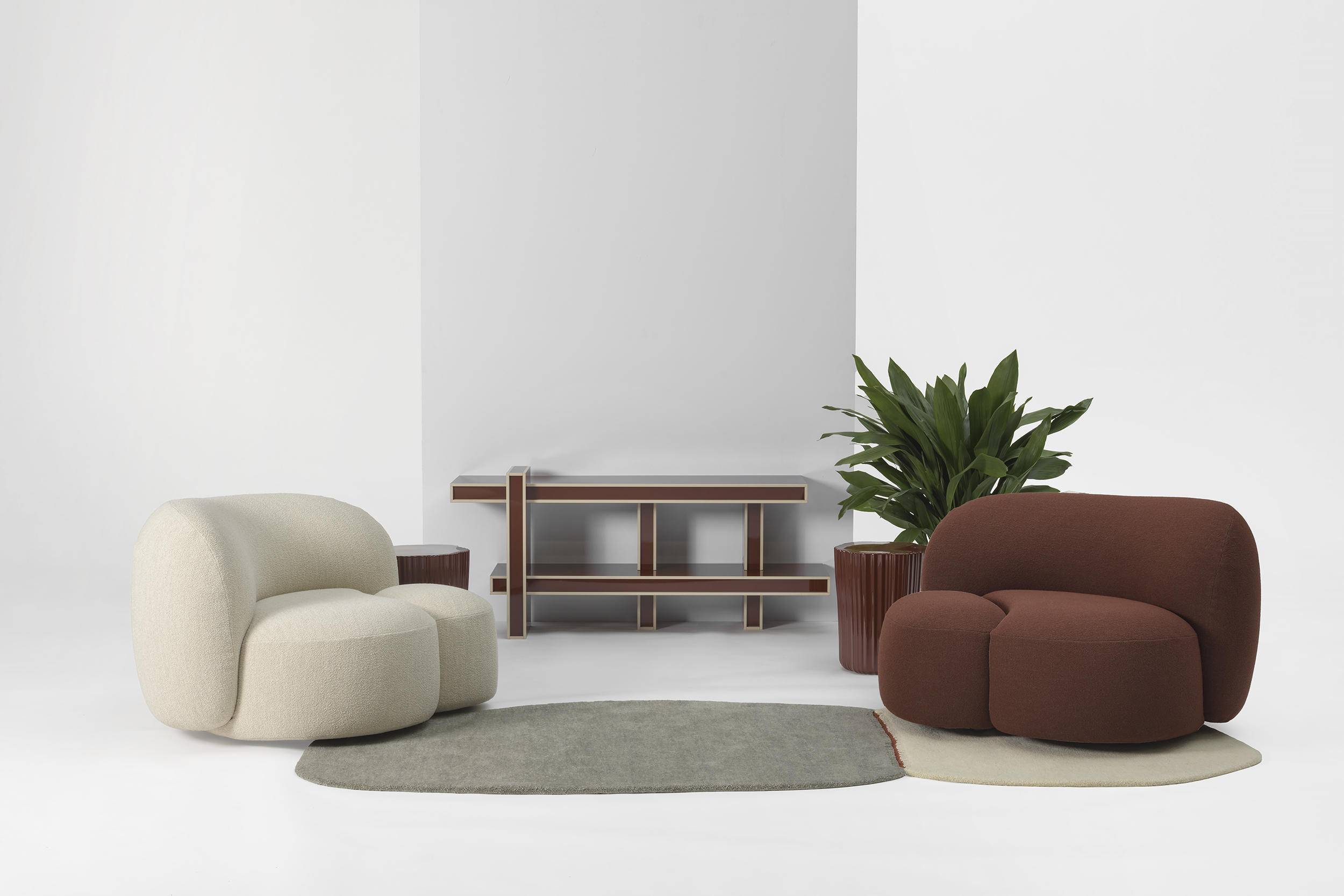 设计师 Ludovica Serafini + Roberto Palomba 试图传达⼀种随性、⼤⽅且灵活的舒适理念。沙发造型圆润且具包覆感,设计语⾔则保持克制。细节处理利落精准,脚架在提供⽀撑之余也兼顾了装饰性,提升了整体结构的轻盈感。⾊彩搭配强调同⾊系的协调与织物纹理的对⽐,呈现出内敛⽽不失亲和⼒的视觉效果。