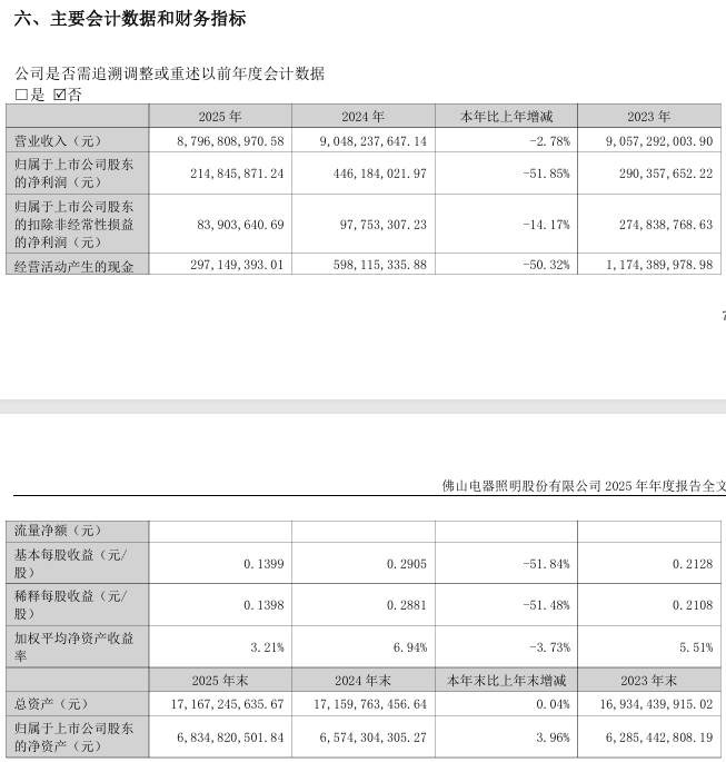 佛山照明4月16日披露2025年年度报告。报告显示,公司2025年实现营业收入87.97亿元,同比下降2.78%;归母净利润2.15亿元,同比大幅下降51.85%;扣非净利润8,390.36万元,同比下降14.17%。营收与利润双降之下,公司整体盈利质量承压,净利率由上年的4.93%收窄至2.44%。