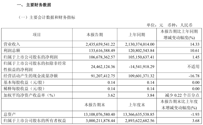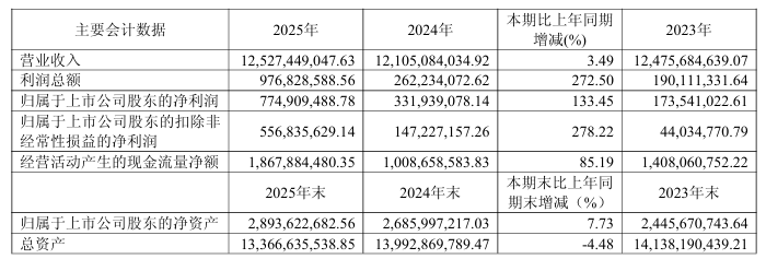 报告显示,公司全年实现营业收入125.27亿元,同比增长3.49%;归属于上市公司股东的净利润7.75亿元,同比大幅增长133.45%;扣非净利润5.57亿元,同比增长278.22%。公司表示,业绩变动主要系报告期内收入增加、毛利率提升所致。