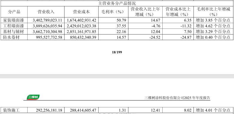 公司表示,家装墙面漆收入增长主要系拓展新渠道、加大推广投入和促销、加强分销渠道管理等所致;基材与辅材收入增长主要系加大市场开拓所致;装饰施工收入增长主要系2025年7月起并表美置乡墅等子公司。而工程墙面漆、防水卷材收入下降主要受下游需求疲软影响。