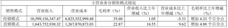 分销售模式来看,经销模式实现营业收入105.99亿元,同比增长1.05%,毛利率35.60%,同比提升4.32个百分点;直销模式实现营业收入16.44亿元,同比增长16.55%,毛利率22.87%,同比提升4.88个百分点。