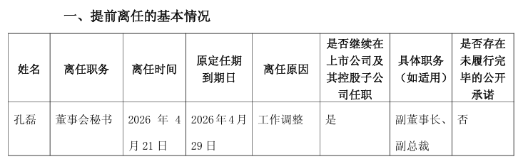 此外,公司副董事长兼董事会秘书孔磊先生因工作调整,不再担任董事会秘书职务,辞职后继续担任公司副董事长及新聘任的副总裁职务。公司董事会同意聘任张益飞先生为董事会秘书,任期自董事会审议通过之日起至2026年10月29日止。